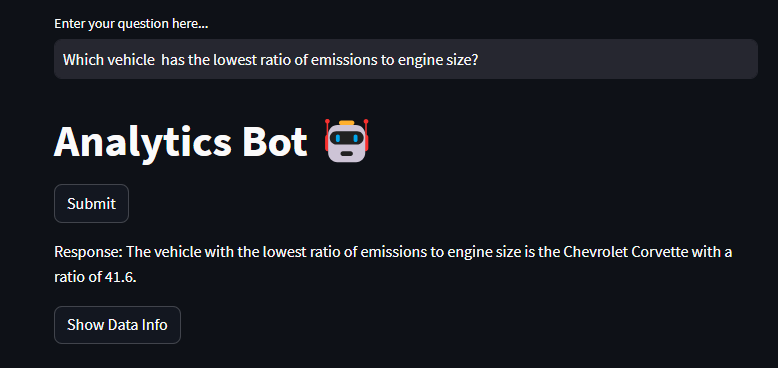 I tested the analytics bot on a CO2 emissions dataset sourced from Kaggle recording emissions, engine size, and fuel consumption data for various vehicles.